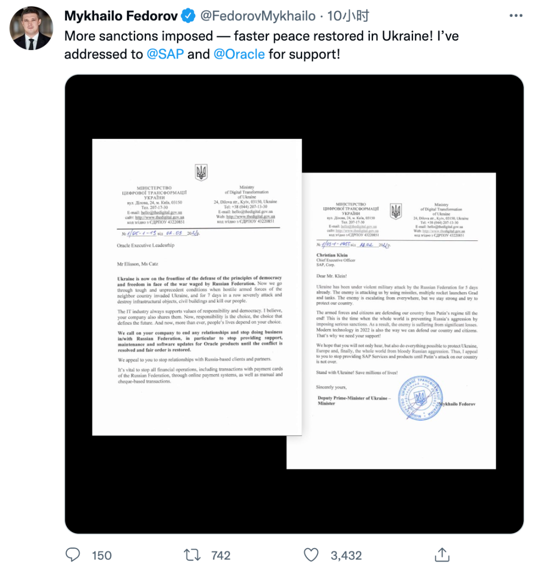 2022年3月2日,烏克蘭副總理兼數(shù)字化轉型部長Mykhailo Fedorov在推特上曬出了發(fā)給Oracle聯(lián)合創(chuàng)始人兼首席技術官Larry Ellison、Oracle首席執(zhí)行官Safra Catz和SAP首席執(zhí)行官Christian Klein的兩封信的副本。