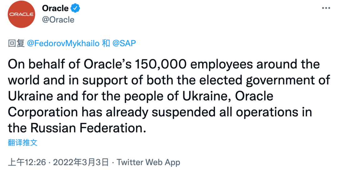 Oracle隨后發(fā)推文稱:“為了Oracle在全球各地的150000名員工的利益,為了支持烏克蘭民選政府和烏克蘭人民,Oracle公司已經暫停了在俄羅斯聯(lián)邦的所有業(yè)務。”