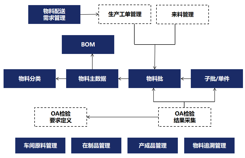 MES物料管理功能通過標識和數據采集,可以實現對在制品物料的全程跟蹤。MES物料管理功能對其品種、狀態、數量、位置、所在車間與工段、正在進行加工的工序等信息進行管理,并可以對其在工序間、工段間、車間之間轉移過程進行跟蹤,同時支持在車間內的在制品分布情況進行查詢統計。