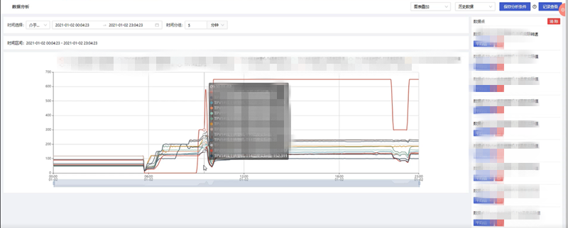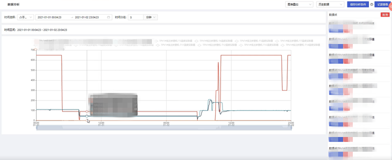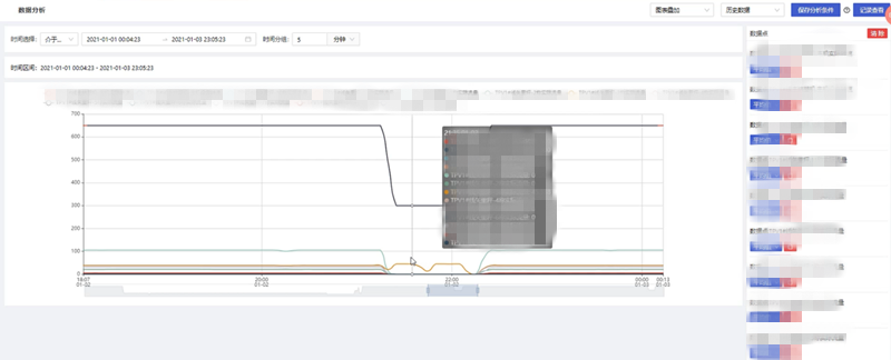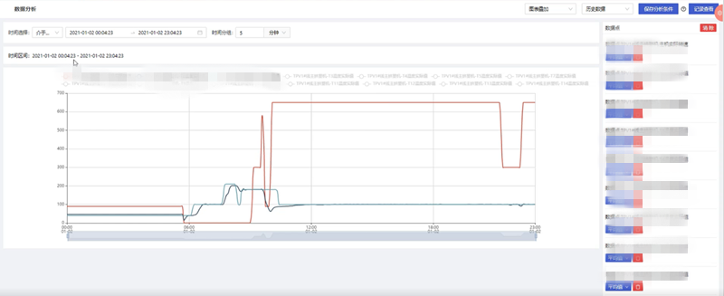 根據(jù)用戶的需要,對一段時間內(nèi)的歷史數(shù)據(jù)或?qū)崟r數(shù)據(jù)按照一定的統(tǒng)計頻率進(jìn)行多個維度的數(shù)據(jù)分析,統(tǒng)計頻率包含不限、10秒、30秒、10分鐘、30分鐘、1小時,通過添加變量操作,在彈出的變量選擇彈窗中可多選數(shù)據(jù)點信息進(jìn)行分析;數(shù)據(jù)分析得到的圖表顯示形式包括折線圖以及表格形式。多個數(shù)據(jù)點信息圖表的展示形式包括平鋪、疊加、標(biāo)簽顯示以及合并表格顯示,根據(jù)不同的需求選擇對應(yīng)的展示形式,靈活性高。