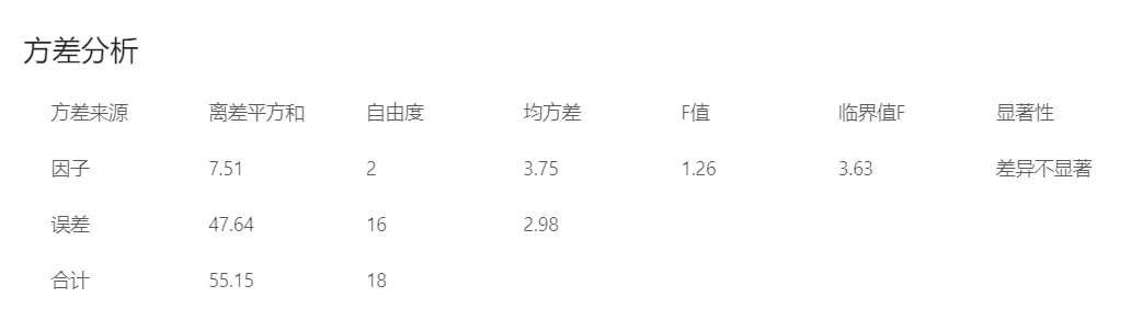 3的分析結果中可以看出,運用單因素方差分析得出的F值小于臨界值FF值是兩個均方的比值[效應項/誤差項],不可能出現負值,F值越大(與給定顯著水平的臨界值F值相比較),說明數據之間效果(差異)越明顯,誤差項越小說明(效果)差異越小。