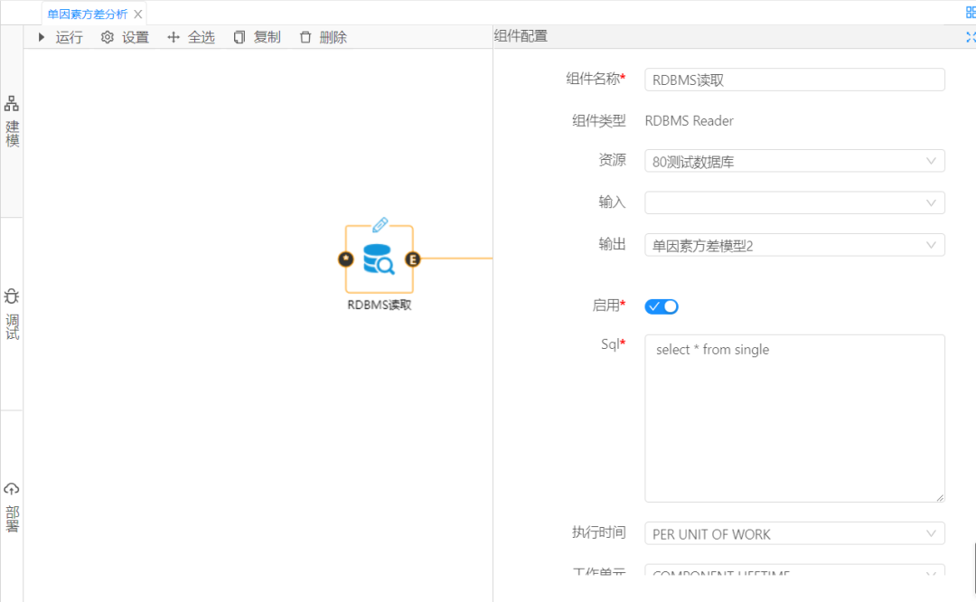 使用集成好算法的單因素方差分析組件進行數據的單因素分析處理,對組件參數進行設置,因素字段配置為factor結果值配置為檢驗結果result,顯著性水平設置為0.05,單擊運行,從調試面板中查看分析結果。