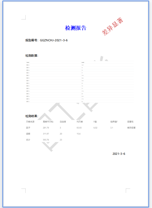 國工數據大腦平臺可直接獲取實驗室LIMS系統中的實驗數據,直接將實驗數據對接到創建好的單因素方差分析模型中,根據得出的分析結果自動對報告進行判定,代替人工判定;并將存在顯著性差異的報告重點推送給相關領導引起重視。根據領導對存在顯著性差異報告的處理,可自動觸發二次檢驗流程等操作。