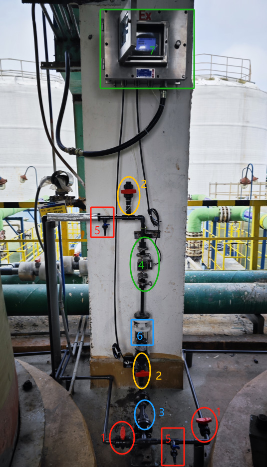 圖中圈1的地方為手動閥,當打開其中一個手動閥,物料即流經管道,接著打開電磁閥(圈2)物料先經過Y型過濾器(圈3),再經過視盅(圈6),然后充滿光譜儀(圈4)一直流經至取樣口(圈5),打開取樣口進行取樣送檢,同時光譜儀開始檢測,當實驗室檢測結果出來后,我們將同批次光譜檢測的物料有效氯的含量參數和游離堿的含量參數進行標定,以此類推,進行大量取樣檢測標定過程。檢測結果在光譜控制柜(圈7)上直接顯示。