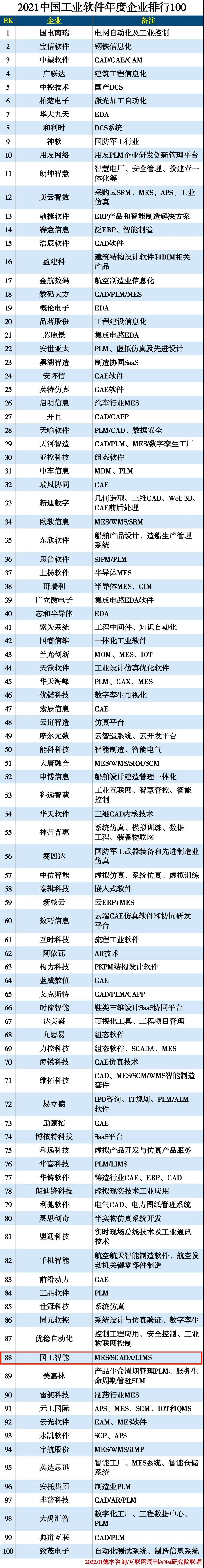 1月10日,《互聯(lián)網(wǎng)周刊》聯(lián)合eNET研究院、德本咨詢發(fā)布了“2021中國(guó)工業(yè)軟件年度企業(yè)排行100”排行,國(guó)工智能位列第88名!